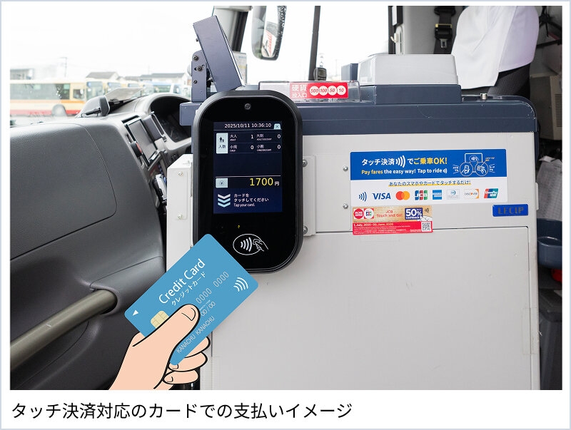 - 未予約のお客様につきましては、バス車内で「PASMO」・「Suica」など交通系ICカードやタッチ決済対応のカード(クレジット・デビット・プリペイド)または同カードが設定されたスマートフォン等で運賃をお支払いいただくことが可能です。ご利用の際は、乗務員にお申し出のうえ、バス車内のICカード読取部にタッチしてください。(全停留所共通)