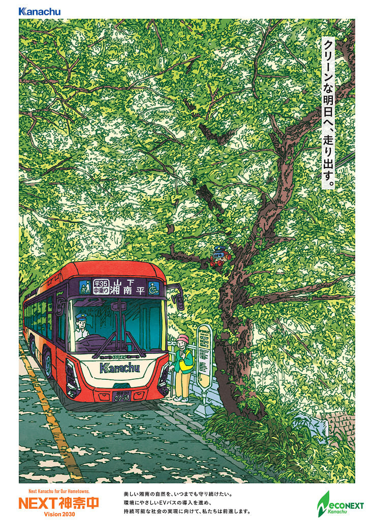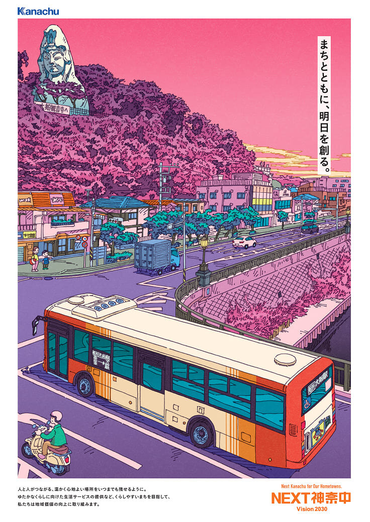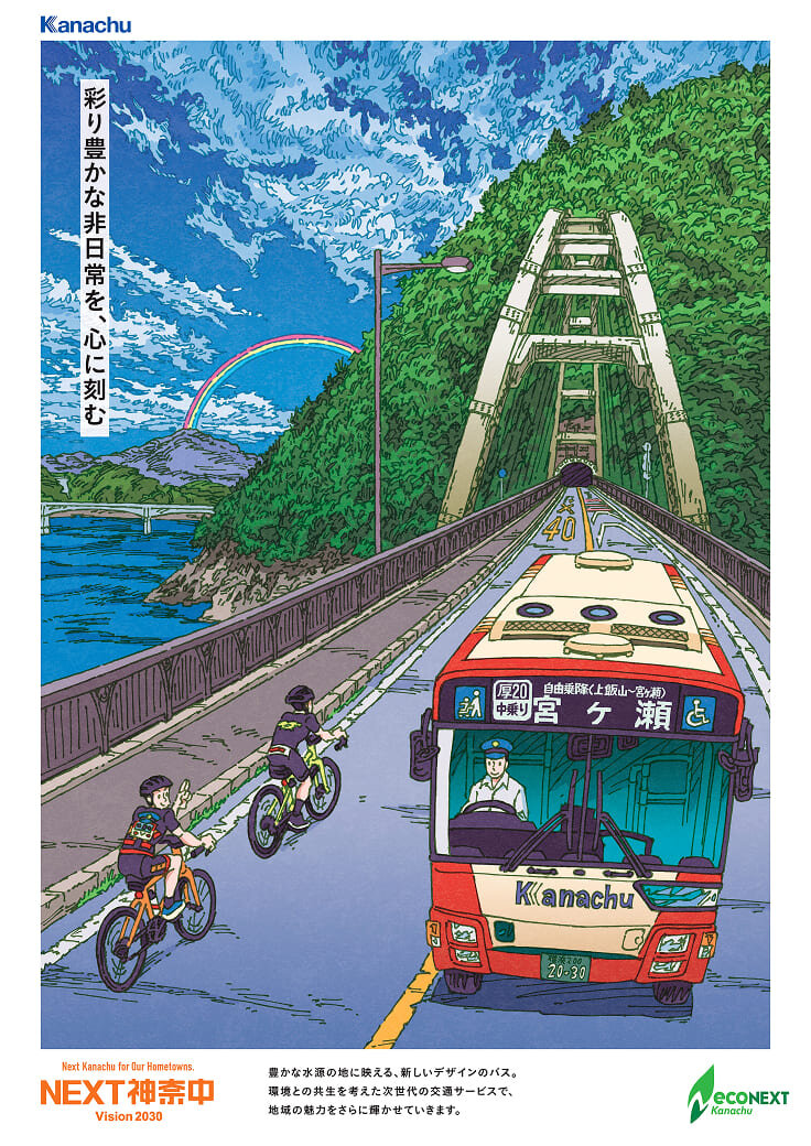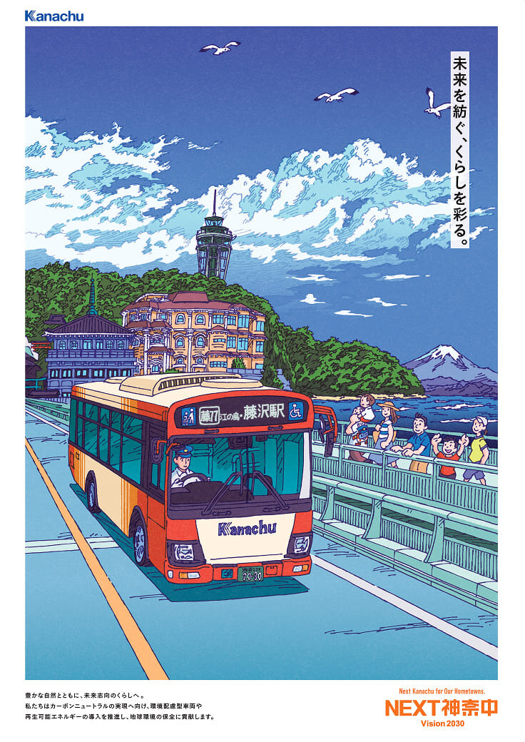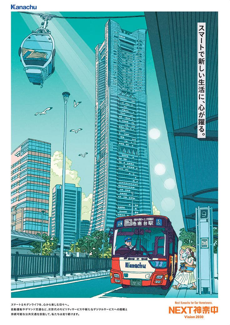 (おことわり)イラストは、沿線を走るバスの運行風景を基に脚色したものであり、実際の風景とは異なる場合があります 。