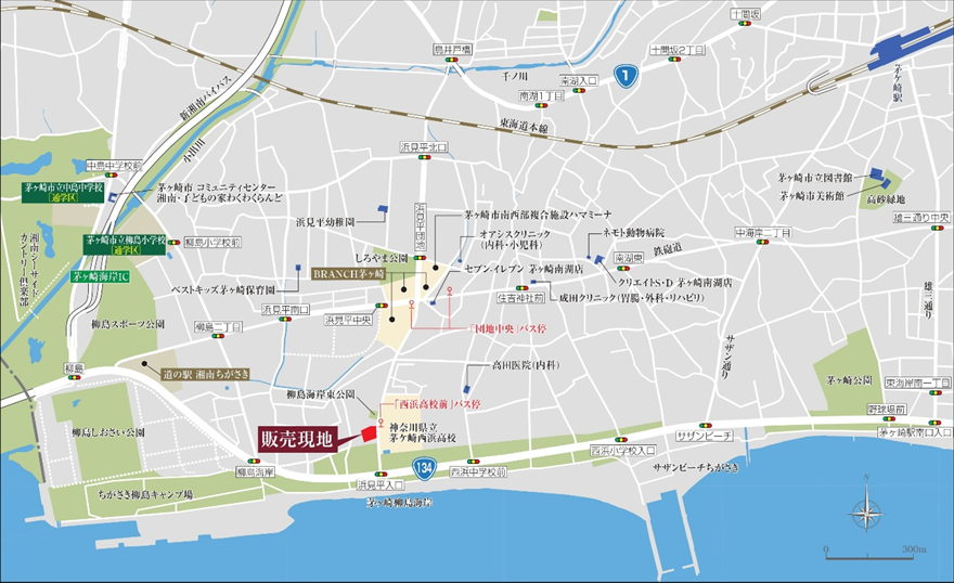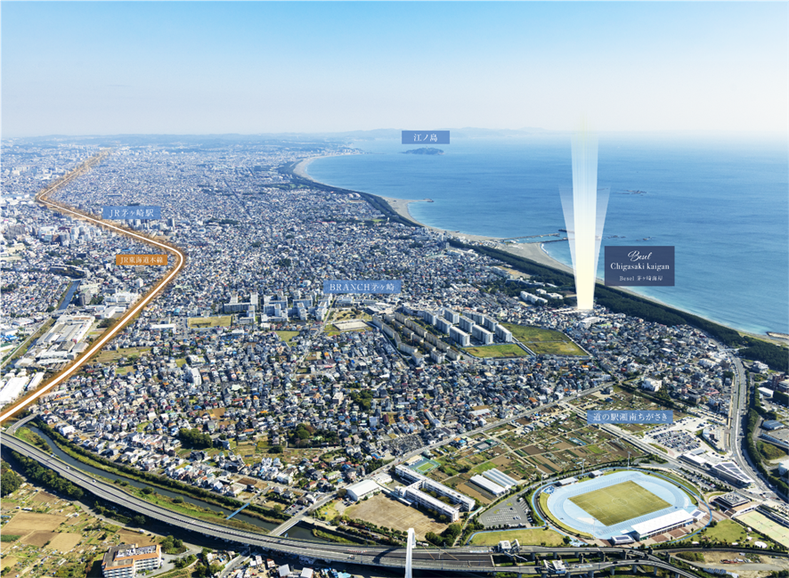 本物件は茅ヶ崎海岸まで徒歩2分の海辺エリアに誕生いたします。周辺には複合商業施設 「BRANCH茅ヶ崎」 や市民交流施設「ハマミーナ」、さらにキャンプ場やスポーツ公園など、暮らしとレジャーを楽しめる住環境が整っており、都市の利便性と海辺の開放感が調和する街並みを創出しています。