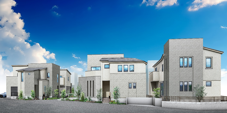 また、建物は白とグレーのモノトーンを基調としたボックスフォルムが連なる美しいシルエットで、まるでおしゃれな商業施設のような洗練された街並みを形成しております。さらに、効率的な家事動線やIoT設備に加え、屋外シャワーブースや土間ルームを備えた湘南にふさわしい快適な暮らしを叶える住まいを実現しました。
