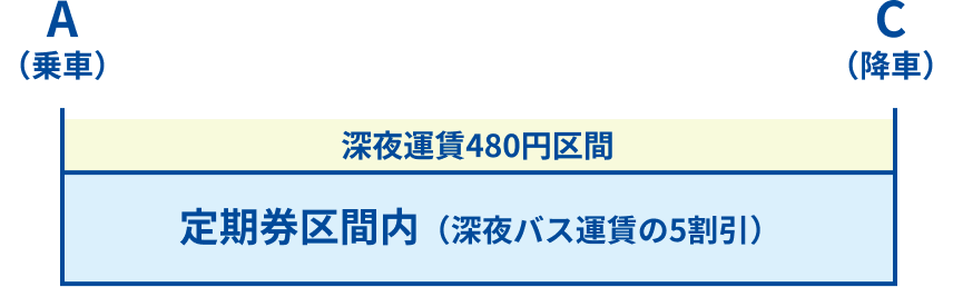 (例)定期券面の区間が「A~C」で、Aバス停~Cバス停まで乗車した場合、240円(480÷2)をお支払いください。