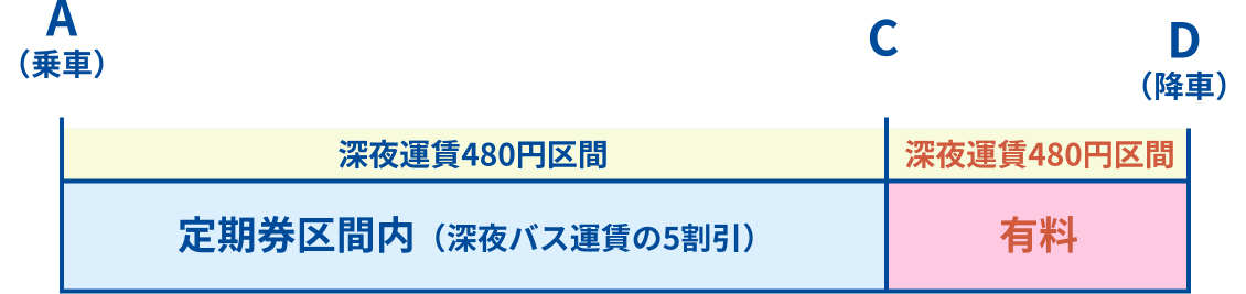 (例)定期券面の区間が「A~C」で、Aバス停~Dバス停まで乗越した場合、240円(480÷2)+480円→720円をお支払いください。
