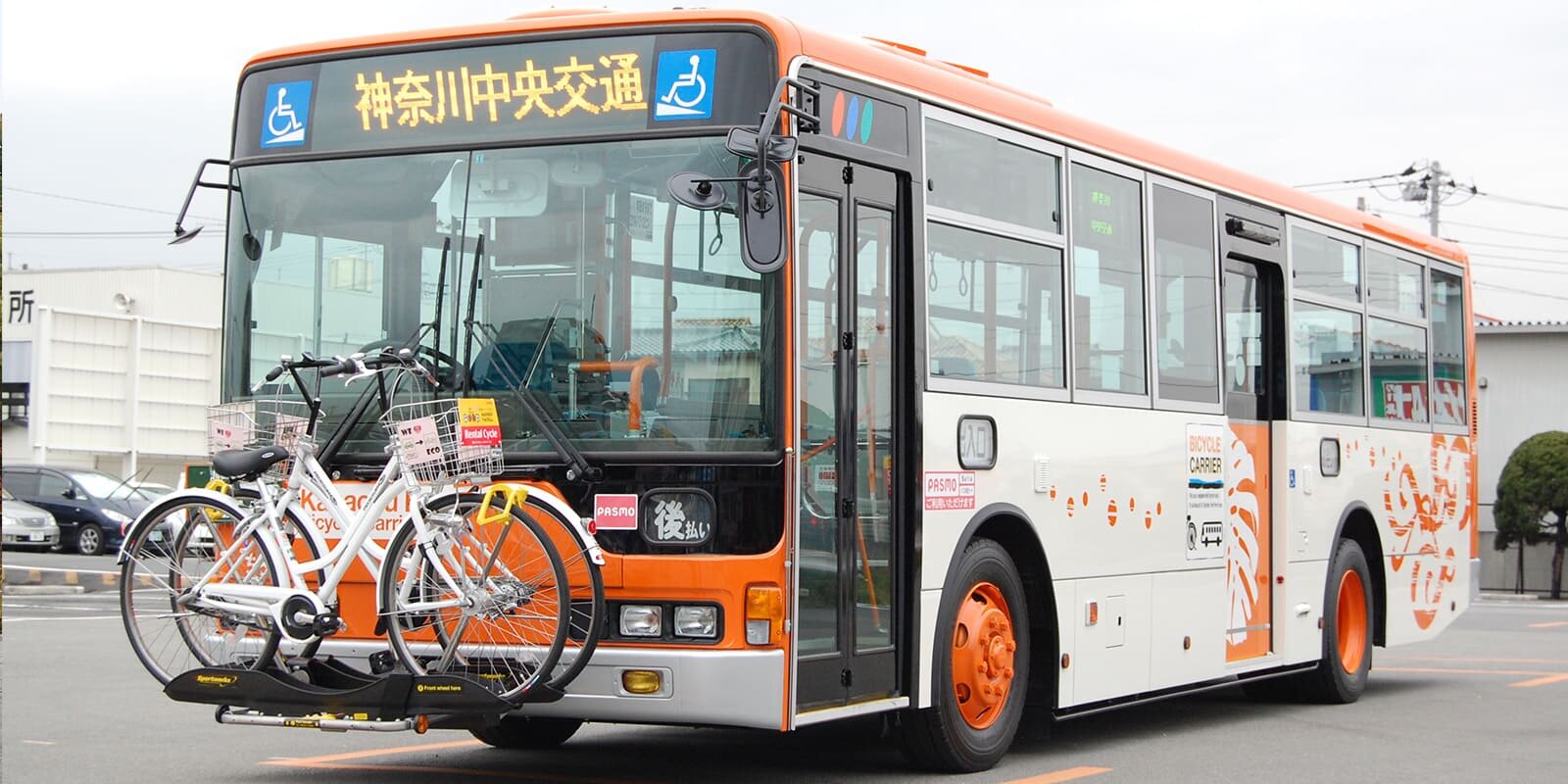 前面に自転車を載せられる路線バスを一部路線で運行しています。自転車の飲酒運転や傘を差しながらの片手運転などによる交通事故の防止にも貢献します。