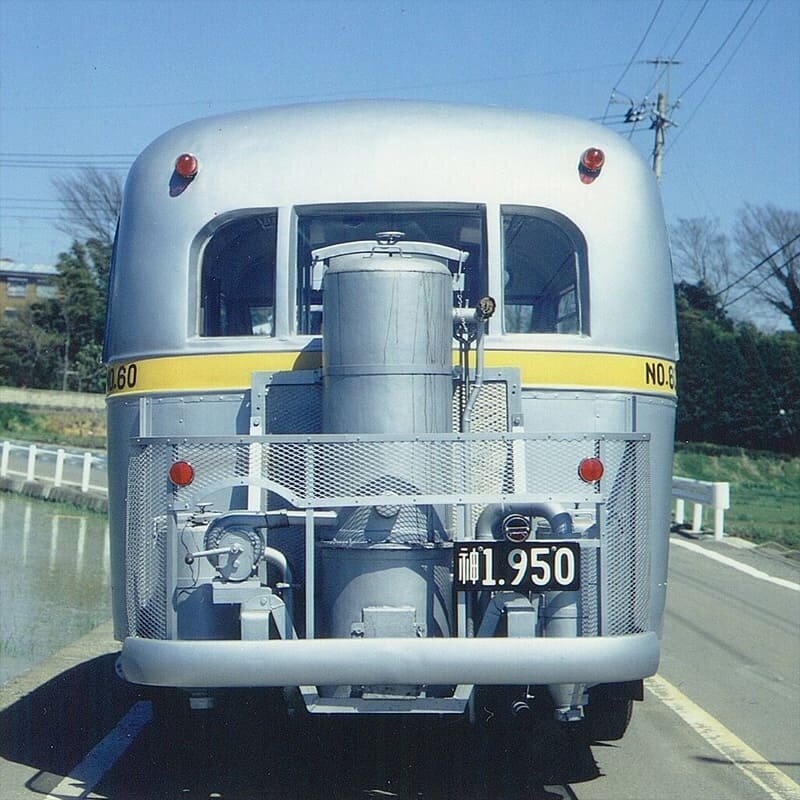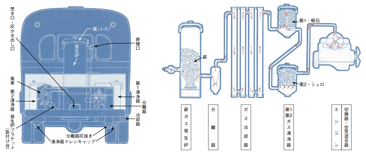 正しくは「石油代用燃料使用装置設置自動車」という。木炭・薪・石炭・コーライトなどをそれぞれ加熱してガスを発生させ、そのガスでエンジン作動を行います。